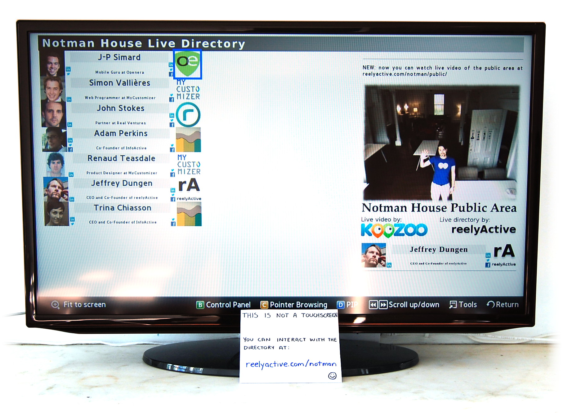 We created a live directory for members of the cohort and other occupants of Notman House. Anyone could create their own digital profile and have it appear on screen when they were present with one of our active RFID tags.